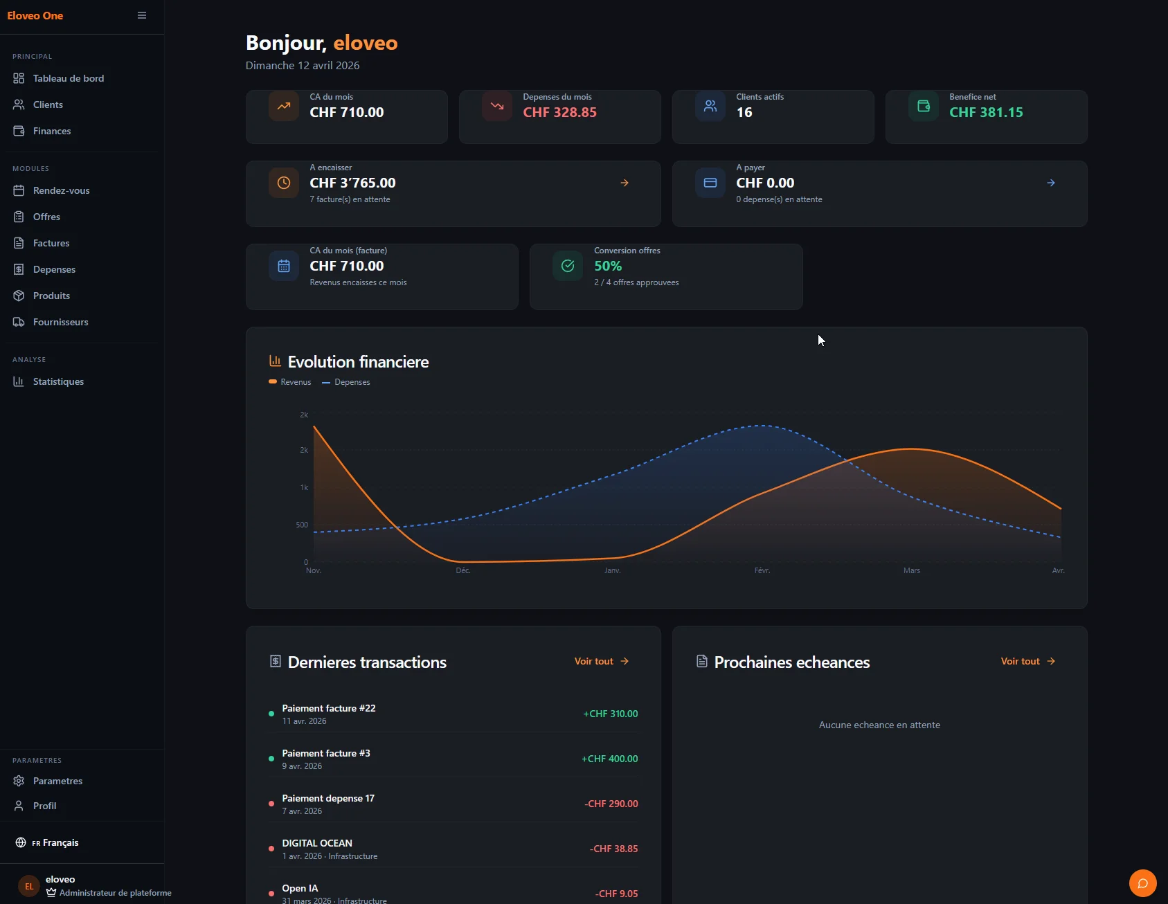 Vollständig intern entwickelte SaaS Business Suite zur Steuerung von Eloveo. Finanz-Dashboard in CHF, Kunden-CRM, Terminverwaltung, Modul für kommerzielle Offerten mit Rechnungsgenerierung, Transaktionsverfolgung und Performance-Analytics. Konkreter Beweis unserer Fähigkeit, komplexe Geschäftstools zu entwickeln.